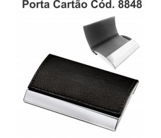 Descrição: Porta cartão de metal com couro sintético. Couro com textura e costura preta, parte interna revestida com veludo.
