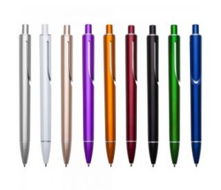 Descrição: Caneta plástica inteira colorida com detalhes prata. Clip "acoplado" ao corpo da caneta, possui anel superior e inferior prata. Aciona por clique.