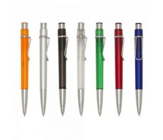 Descrição: Caneta plástica inteira colorida com detalhes em prata. Clip de metal, possui anel colorido no acionador. Aciona por clique.