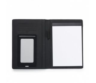 Descrição: Pasta convenção pequena de couro sintético com porta celular. Possui “bolso” para arquivar documentos, porta celular com visor fosco, três divisórias para cartões, suporte elástico para caneta(não acompanha) e bloco com aproxim