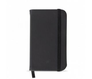 Descrição: Caderneta tipo moleskine emborrachado de frente e verso liso, marcador de página em cetim e fita elástica para fechar. Contém aproximadamente 80 folhas pardas pautadas.