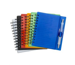Descrição: Bloco de anotações acrílico colorido com wire-o e caneta plástica. Possui aproximadamente 70 folhas brancas pautadas, caneta plástica colorida com detalhes em branco(acionador e ponteira prata). observação: Bloco 16,1 cm x 14,8 cm