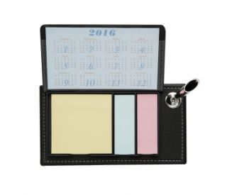 Descrição: Bloco de anotações em couro sintético e suporte plástico para caneta(não acompanha caneta). Possui costura branca, acompanha calendário no suporte plástico interno e bloco com aproximadamente 120 folhas amarelas, azuis e rosas auto