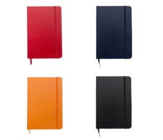 Descrição: Caderneta tipo moleskine em material sintético com capa lisa, fita elástica para fechar e fita “marca página” em nylon. Possui aproximadamente 80 folhas amarelas com pauta.