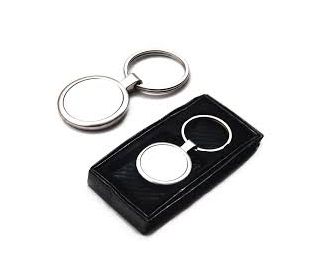Descrição: Chaveiro de metal redondo com chapa central, verso liso.