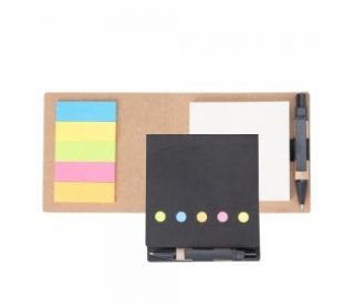Descrição: Mini bloco de anotações ecológico com post-it e caneta. Abertura superior, possui cinco detalhes circulares vazados na parte inferior. Bloco amarelo sem pauta com aproximadamente 50 folhas e cinco blocos auto-colantes coloridos com 21 f