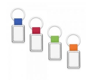 Descrição: Chaveiro metal retangular com detalhe emborrachado colorido, frente e verso liso com chapa inox central.