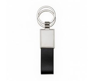 Descrição: Chaveiro metal com duas argolas e detalhe emborrachado. Chapa central grafite espelhado e verso prata brilhante, alça preta emborrachada.