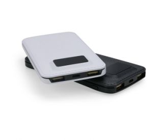 Descrição: Power bank plástico com visor digital. Material plástico resistente com texturização semelhante à couro sintético, possui botão lateral para ligar e desligamento automático. Possui entrada DC 5V e duas saídas DC 5V, visor digital