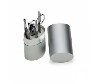 Descrição: Kit manicure 5 peças em estojo oval de alumínio. Possui lixa, tesoura, pinça, empurrador de cutícula e cortador de unha.