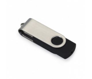 Descrição: Pen drive de metal giratório 8GB, parte interna preta em plástico resistente. Possui uma “argola” na parte em metal que poderá ser utilizado para colocar algum cordão.