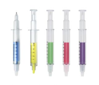 Descrição: Caneta plástica em formato de seringa, esferográfica e marca texto. Possui medidor imitando uma seringa e tampa protetora nas duas pontas.