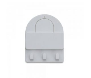 Descrição: Porta chaves plástico com suporte para recados. Possui 3 suportes para chaves e parte superior com encaixe para papéis de recado, verso com três adesivos autocolantes para fixação no local desejado.