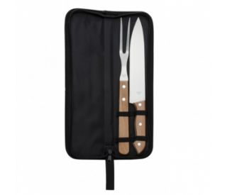 Descrição: Kit churrasco 2 peças em estojo de nylon com alça. Possui: faca e garfo de madeira(na cor preto os cabos são de plástico), acompanha proteções plásticas e parte interna com velcro para guardar as peças.