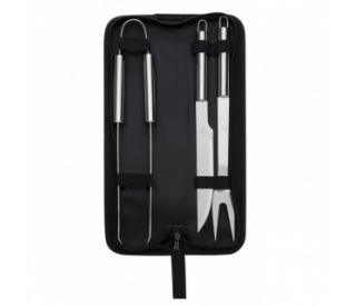 Descrição: Kit churrasco 3 peças em estojo de nylon com alça. Possui: faca(acompanha proteção plástica), garfo(acompanha proteção plástica), pegador em inox e parte interna com velcro para guardar as peças. Acompanha plaqueta para gravação.