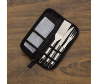 Descrição: Kit churrasco com 5 peças em estojo de nylon com alça. Possui: 2 jogos americanos, espátula, faca e garfo. Acompanha proteções plásticas e parte interna com elástico para guardar as peças.
