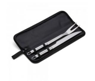 Descrição: Kit churrasco 2 peças em estojo de nylon com alça. Possui: faca(acompanha proteção plástica) e garfo(acompanha proteção plástica), parte interna com elástico de nylon para fixar as peças.