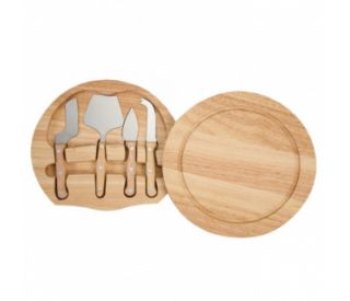 Descrição: Kit queijo 5 peças, possui tábua de madeira com detalhe circular em relevo na parte superior e parte inferior com borrachas antideslizantes. Contém faca reta, espátula, faca com ponta e garfo em inox. Para abrir basta rotacionar a tamp