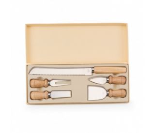 Descrição: Kit queijo com cinco peças em estojo de papelão. Contém os talheres: faca de serra, faca com ponta, espátula, garfo e faca reta.Parte interna com suporte plástico aveludado com encaixe nas formas dos talheres.