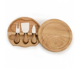 Descrição: Kit queijo 4 peças em madeira, contém tábua com canaleta e parte inferior com borrachas antideslizantes. Possui: espátula, garfo, faca com ponta. Para abrir basta rotacionar a tampa.