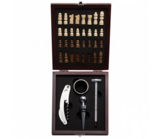 Descrição: Kit vinho formato xadrez, material em MDF vinho com desenho de tabuleiro superior. Parte frontal com trava de metal e parte traseira com dobradiças; compartimento interno revestido com espuma; possui 32 peças de xadrez sendo 16 marfim e 16 marrom. Possui abridor saca rolhas, wine collar, tampa de bico e termômetro.