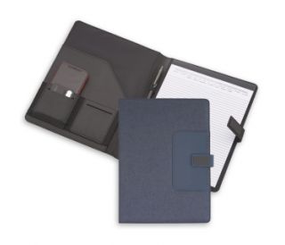 Descrição: Pasta convenção com bloco para anotações. Pasta confeccionada em material sintético, possui fecho imantado com plaquinha emborrachada, “bolso” interno para arquivar documentos, suporte para cartões, celulares e caneta, além de um bloco com folhas brancas pautadas de aproximadamente 22 folhas.