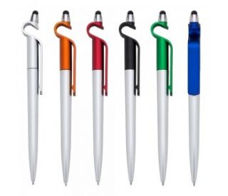 Descrição: Caneta plástica com touch e suporte para celular. Corpo prata com detalhe colorido, clip plástico e borracha touch superior. Aciona por giro.
